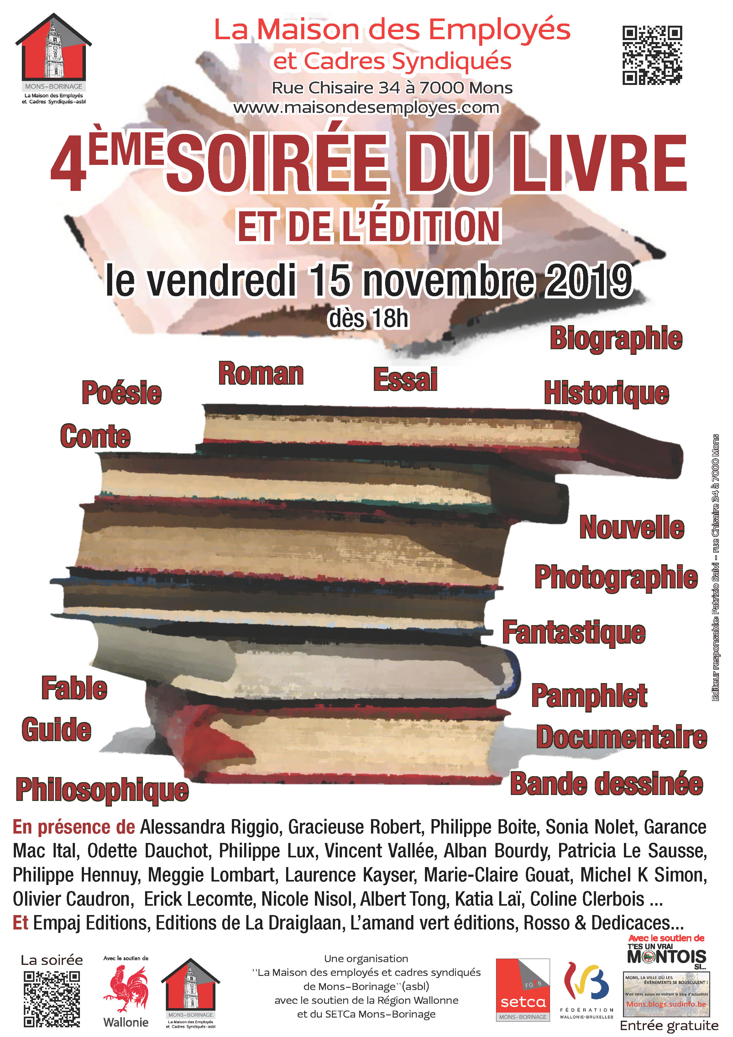 Comme les années précédentes, nous organiserons notre Soirée du livre et de l’édition à La Maison des Employés le vendredi qui précède le super gros événement « Mon’s Livre », soit le vendredi 15 novembre 2019. Ceci permettra aux personnes qui se déplacent de loin de faire d ‘une pierre deux coups et de ce fait de participer à un « super weekend du livre » à Mons!