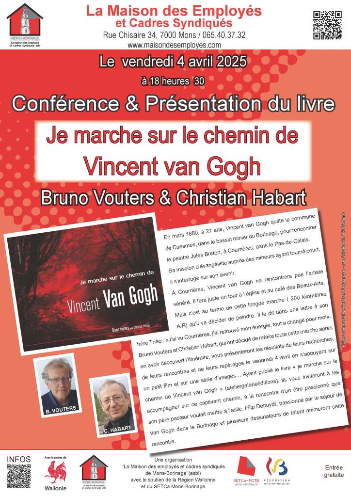 Bruno Vouters et Christian Habart, qui ont décidé de refaire toute cette marche après en avoir découvert l’itinéraire, vous présenteront les résultats de leurs recherches, de leurs rencontres et de leurs repérages le vendredi 4 avril en s’appuyant sur un petit film et sur une série d’images… Ayant publié le livre « je marche sur le chemin de Vincent van Gogh » (ateliergalerieéditions), ils vous inviteront à les accompagner sur ce captivant chemin, à la rencontre d’un être passionné que son père pasteur voulait mettre à l’asile. Filip Depuydt, passionné par le séjour de Van Gogh dans le Borinage et plusieurs dessinateurs de talent animeront cette rencontre.