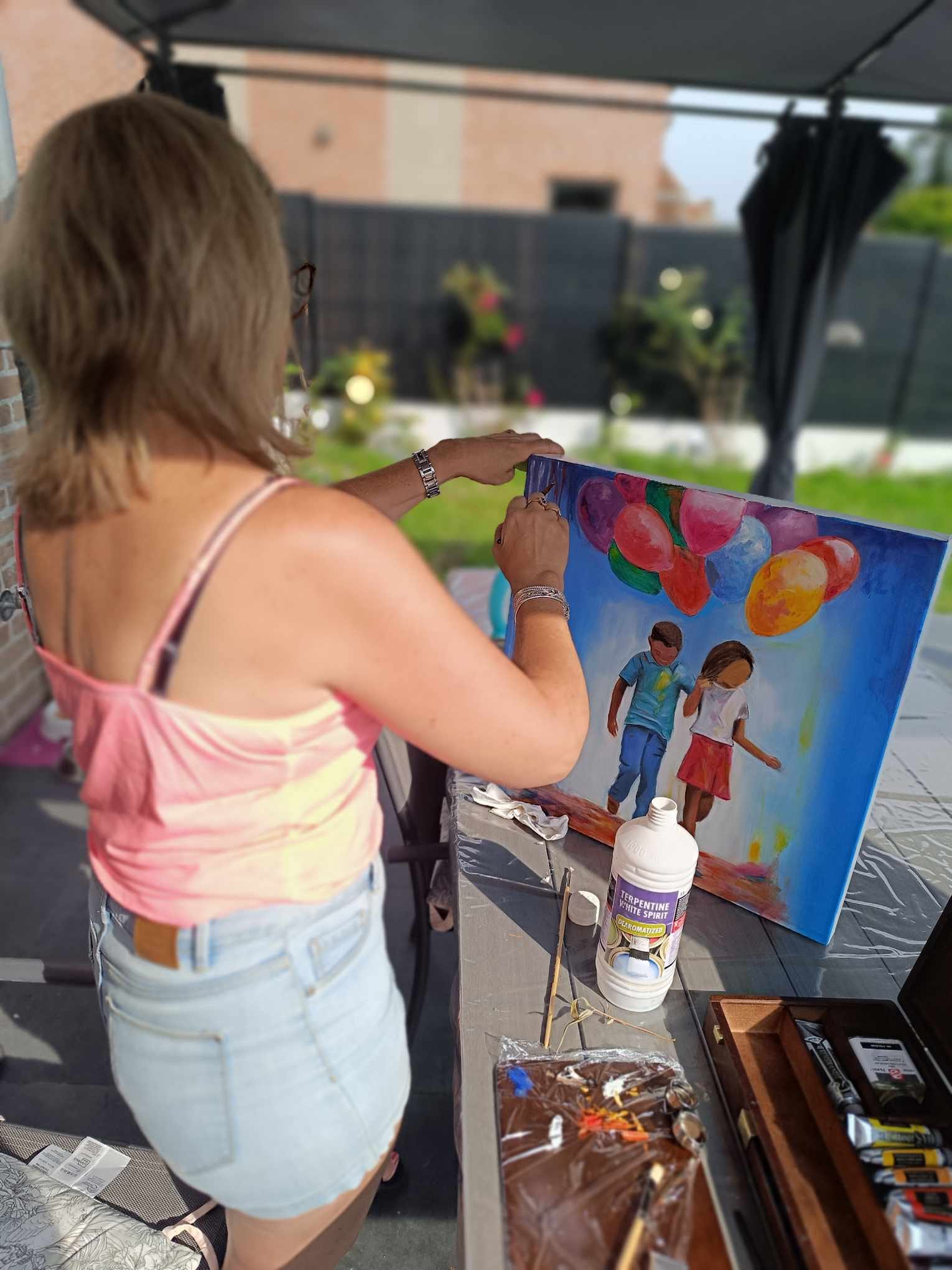 Cécile a également appris à peindre sur différentes structures comme le bois, l’aluminium , la toile de jute, …, ainsi que l’utilisation des différents pinceaux selon l’usage, et l’usage d’ustensiles de la vie quotidienne qui peuvent servir à faire un bel effet, etc..