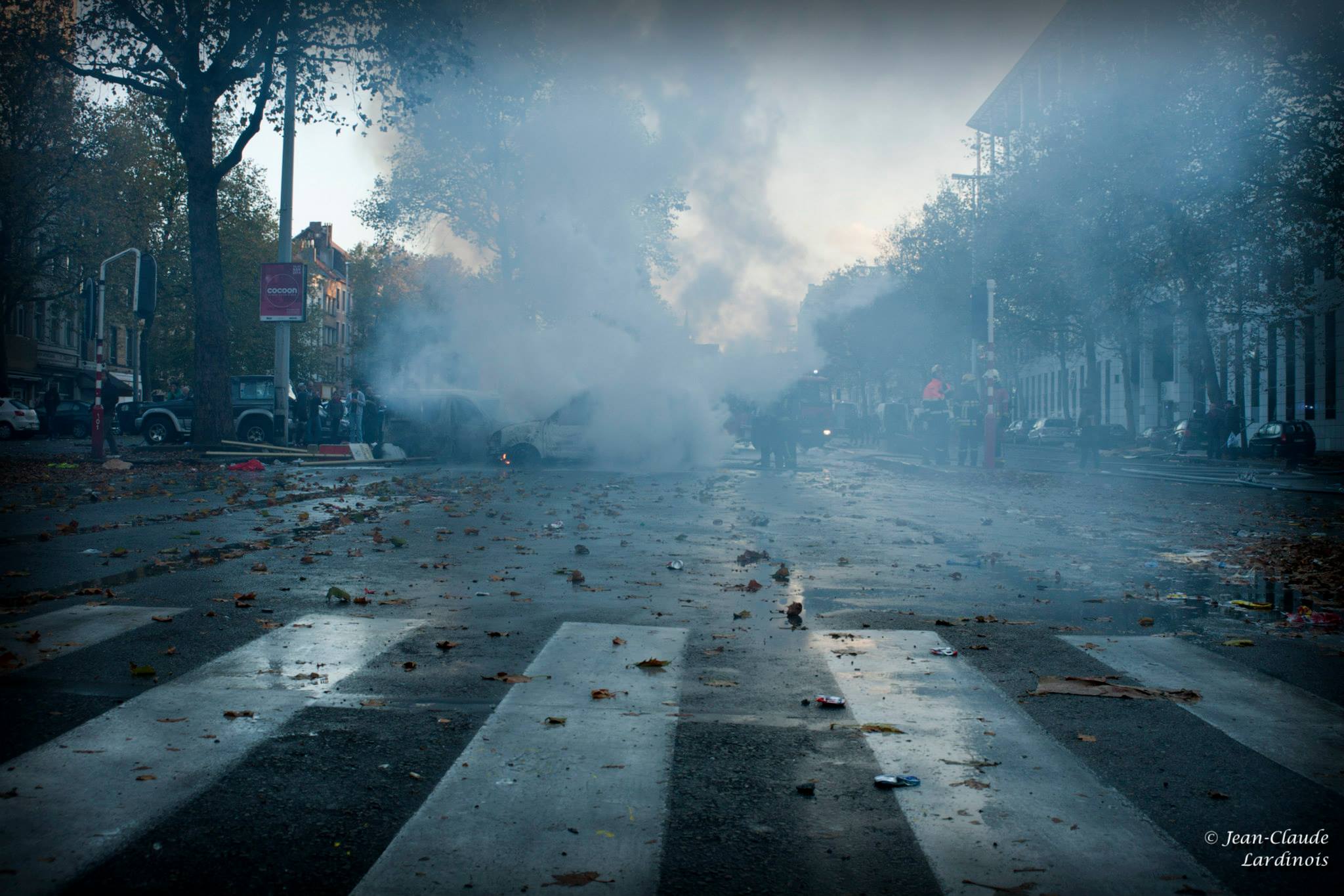 JCL : Oui, enfin, je veux dire l’eau de leur auto pompe…. j’en avais partout, même dans mes poches, dans mes chaussettes, j’étais transpercé…. Puis j’ai été aider un gars qui était blessé, dans la rue, on l’a traîné sur le trottoir…. un autre s’est effondré en larmes, sa voiture brûlait devant lui…. un autre pissait le sang… on se serait cru en guerre… j’ai repris mon souffle, vérifié le matos et je suis reparti, prendre des photos, des photos…. il n’y avait plus que cela qui comptait…. je pense que ce jour-là, j’ai comme qui dirait perdu « mon pucelage », tu vois, il y a eu un choc, un déclic, ce jour-là, j’ai choisi définitivement ma nouvelle vie. ça restera une date clé de ma nouvelle vie… pour la photo mais aussi pour mes idées…