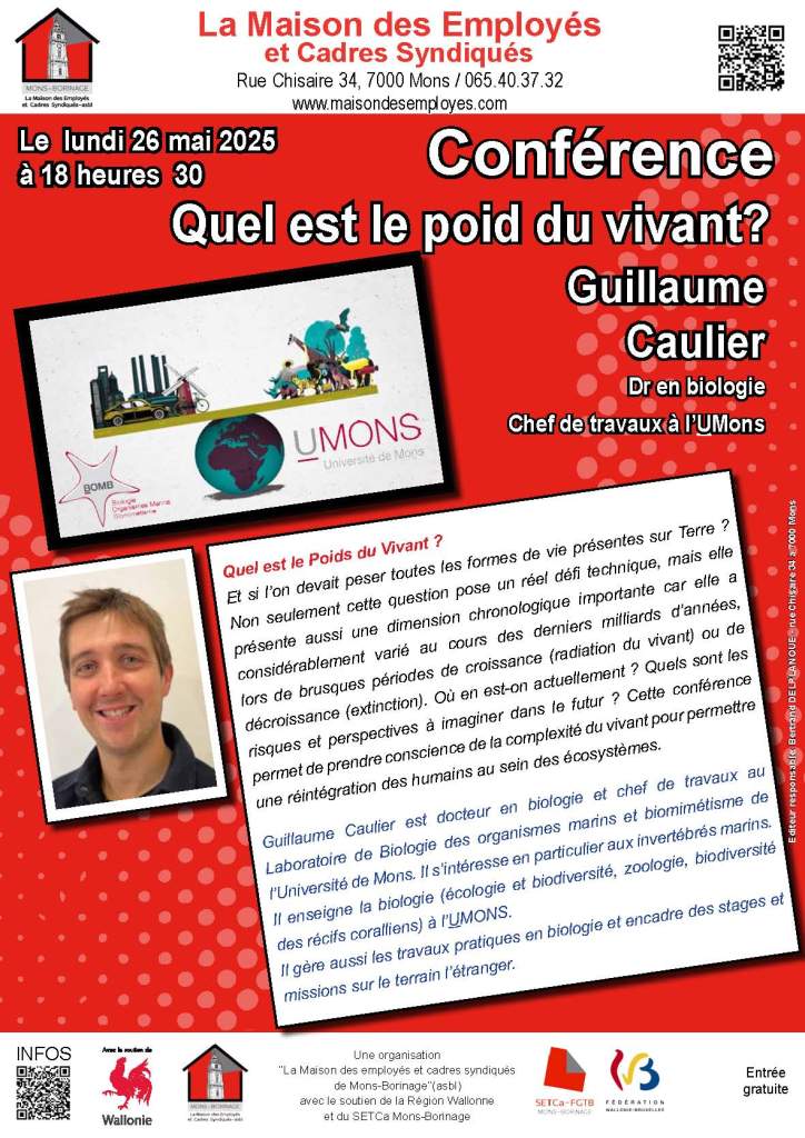 Et si l’on devait peser toutes les formes de vie présentes sur Terre ? Non seulement cette question pose un réel défi technique, mais elle présente aussi une dimension chronologique importante car elle a considérablement varié au cours des derniers milliards d’années, lors de brusques périodes de croissance (radiation du vivant) ou de décroissance (extinction). Où en est-on actuellement ? Quels sont les risques et perspectives à imaginer dans le futur ? Cette conférence permet de prendre conscience de la complexité du vivant pour permettre une réintégration des humains au sein des écosystèmes.