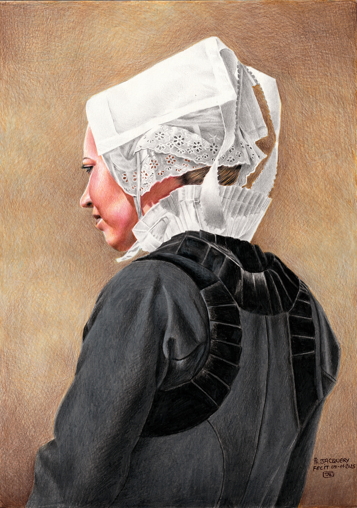 Il a commencé à dessiner vers l’âge de 12 ans. Quatre ans plus tard, il écrivait son premier poème, suite à un amour déçu. Quatre plus tard encore, il fit la rencontre décisive de la culture traditionnelle bretonne et de l’élégance de ses costumes qui ne furent pas sans lui rappeler les personnages de Johannes Vermeer, peintre de la beauté et du silence qu’il vénère.